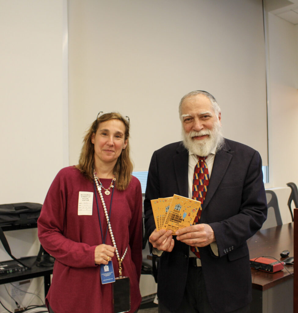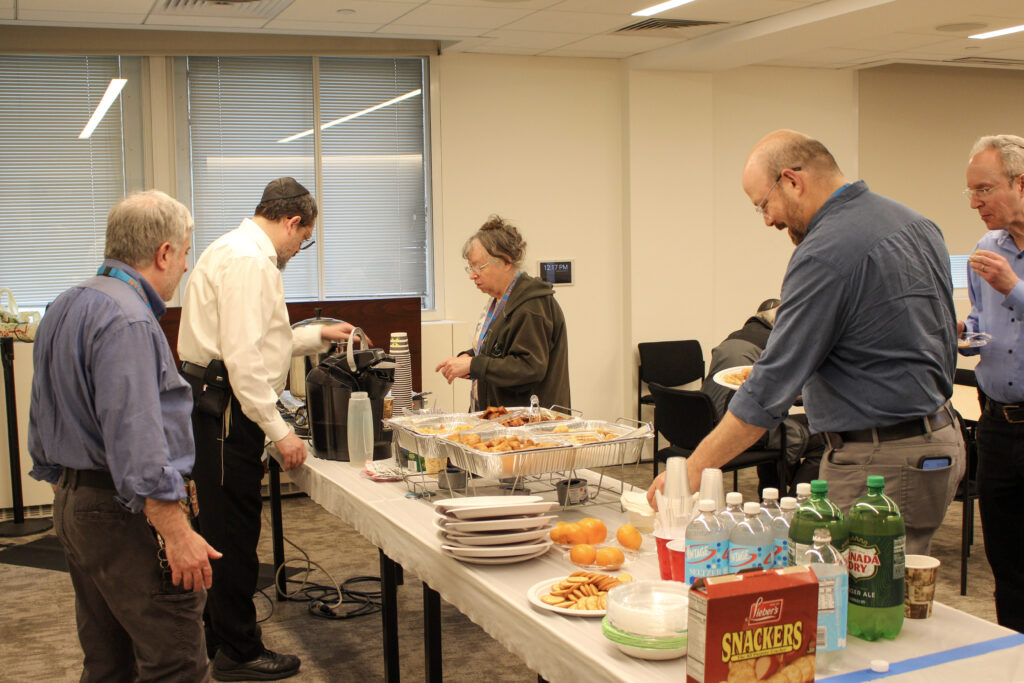The luncheon featured a medley of options, such as knishes, rice, potatoes, egg roll-style bites, and clementines, as well as a variety of educational materials, including videos. Batei Tsibur’s leader, Daniel Mahpour, a Computer Specialist in the Information Technology Department, welcomed attendees, noting how Batei Tsibur has been serving the NYCHA community for 50 years and highlighting its offerings, such as free Hebrew lessons.