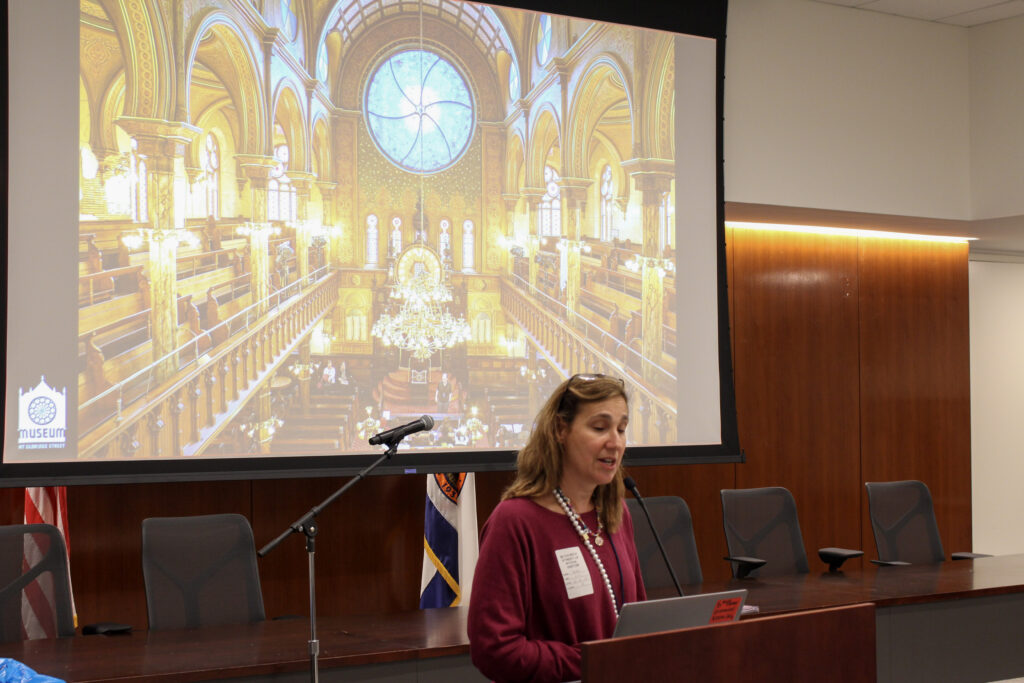 Guest speaker Jaime Cohen, Director of Education at the Eldridge Street Synagogue, then delivered an engaging presentation on the history of the Lower East Side synagogue, which was a central institution during the period between 1880 and 1924, when so many of today’s American Jewish families first arrived on these shores. Through vintage and current photos and historic artifacts, Ms. Cohen described the evolution of the Lower East Side as well as the synagogue, including its restoration.