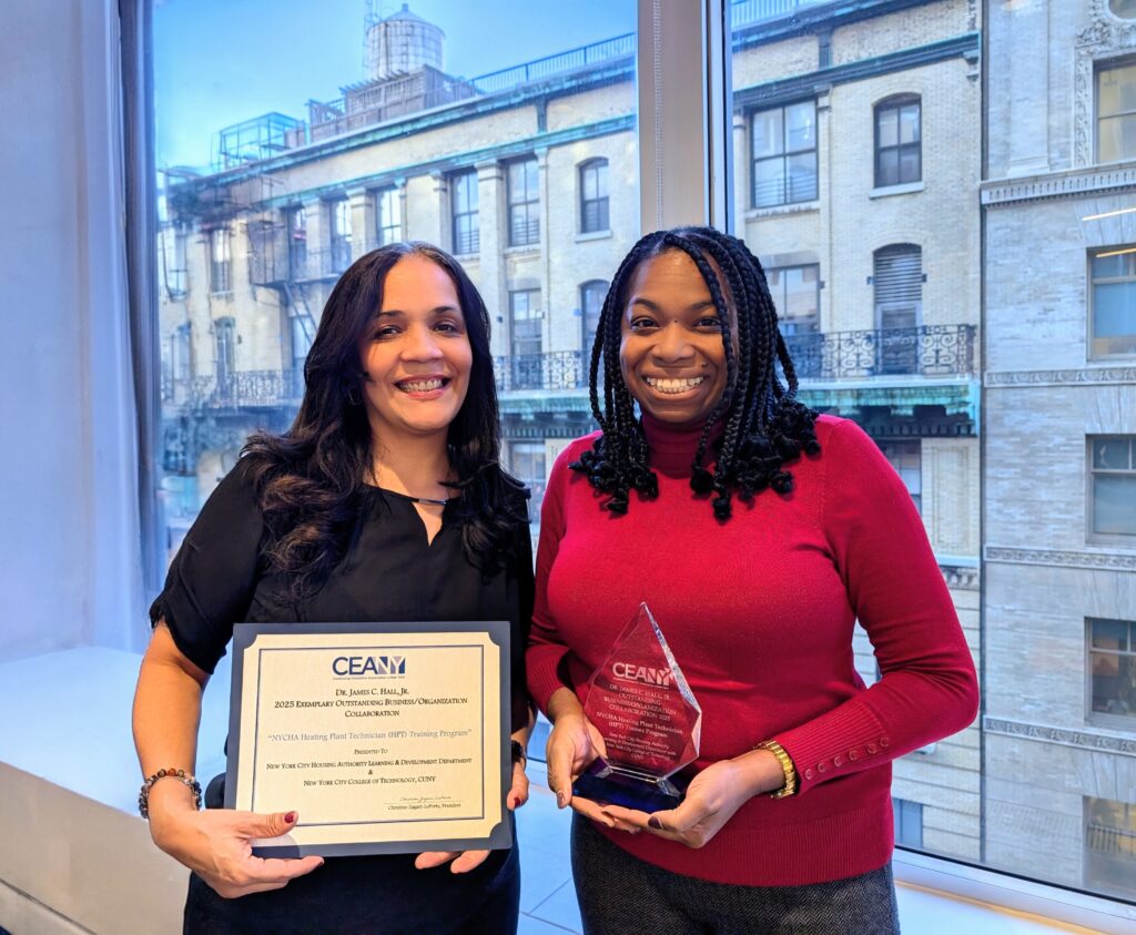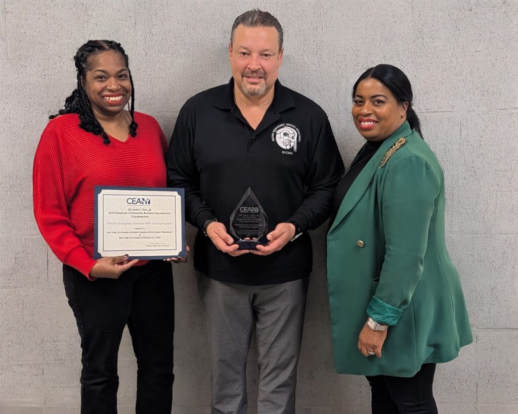 NYCHA’s Learning and Development Department (L&D) was bestowed the James C. Hall Program Award by the Continuing Education Association of New York for Outstanding Business/Organization Collaboration with New York City College of Technology (City Tech), for the operation of the jointly run Heating Plant Technician (HPT) Trainee Program. This innovative job training program was recognized among several program submissions throughout New York State for delivering exceptional results: 95 percent of graduates, who are all NYCHA residents, are hired directly by NYCHA, earning competitive wages, union membership, and long-term benefits.